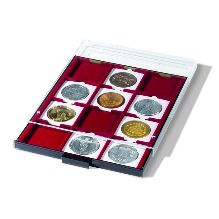 Монетный бокс для капсул Quadrum XL или монет в больших холдерах на 12 ячеек размером 67х67 мм, дымчатый с красным. Leuchtturm. 343230