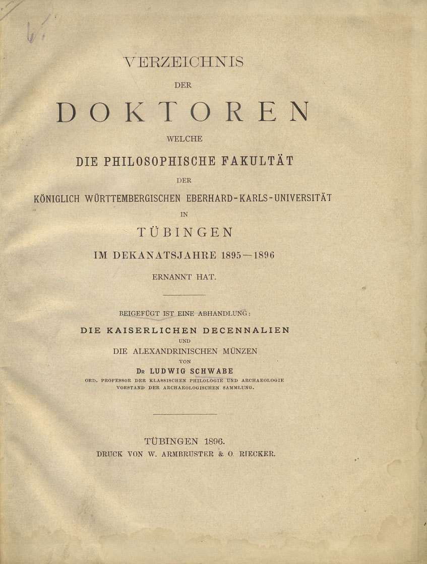 ЛЮДВИГ ШВАБЕ ИМПЕРАТОРСКИЕ ДЕЦЕННАЛИИ И МОНЕТЫ АЛЕКСАНДРИИ (ЯЗЫК: НЕМ.) 1896 LUDWIG SCHWABE, DIE KAISERLICHEN DECENNALIEN UND DIE ALEXANDRINISCHEN M?NZEN, T?BINGER UNIVERSIT?TSSCHRIFTEN, UNIVERSIT?T T?BINGEN VERZEICHNIS DER DOKTOREN WELCHE DIE PHILOSOPHIS 00-01-05-03