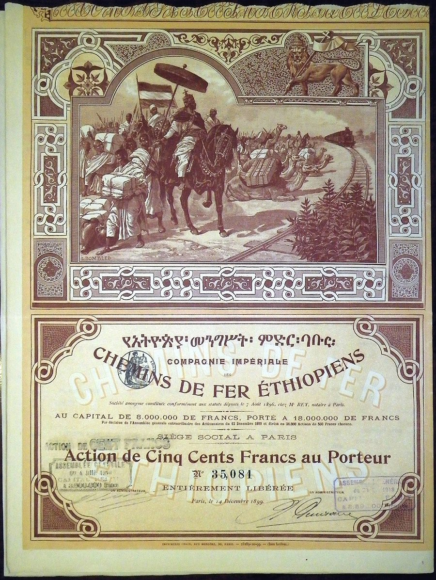 ЭФИОПСКИЕ ЖЕЛЕЗНЫЕ ДОРОГИ АКЦИЯ В 500 ФРАНКОВ НА ПРЕДЪЯВИТЕЛЯ 1899 ФРАНЦИЯ бумага 5553-41