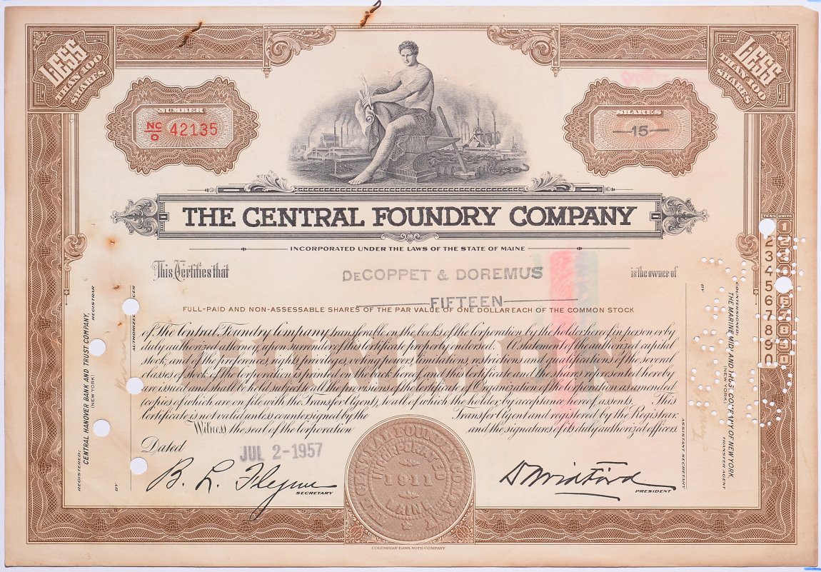 США 15 акций 1957 Центральной литейной компании бумага 5547-6-2-1