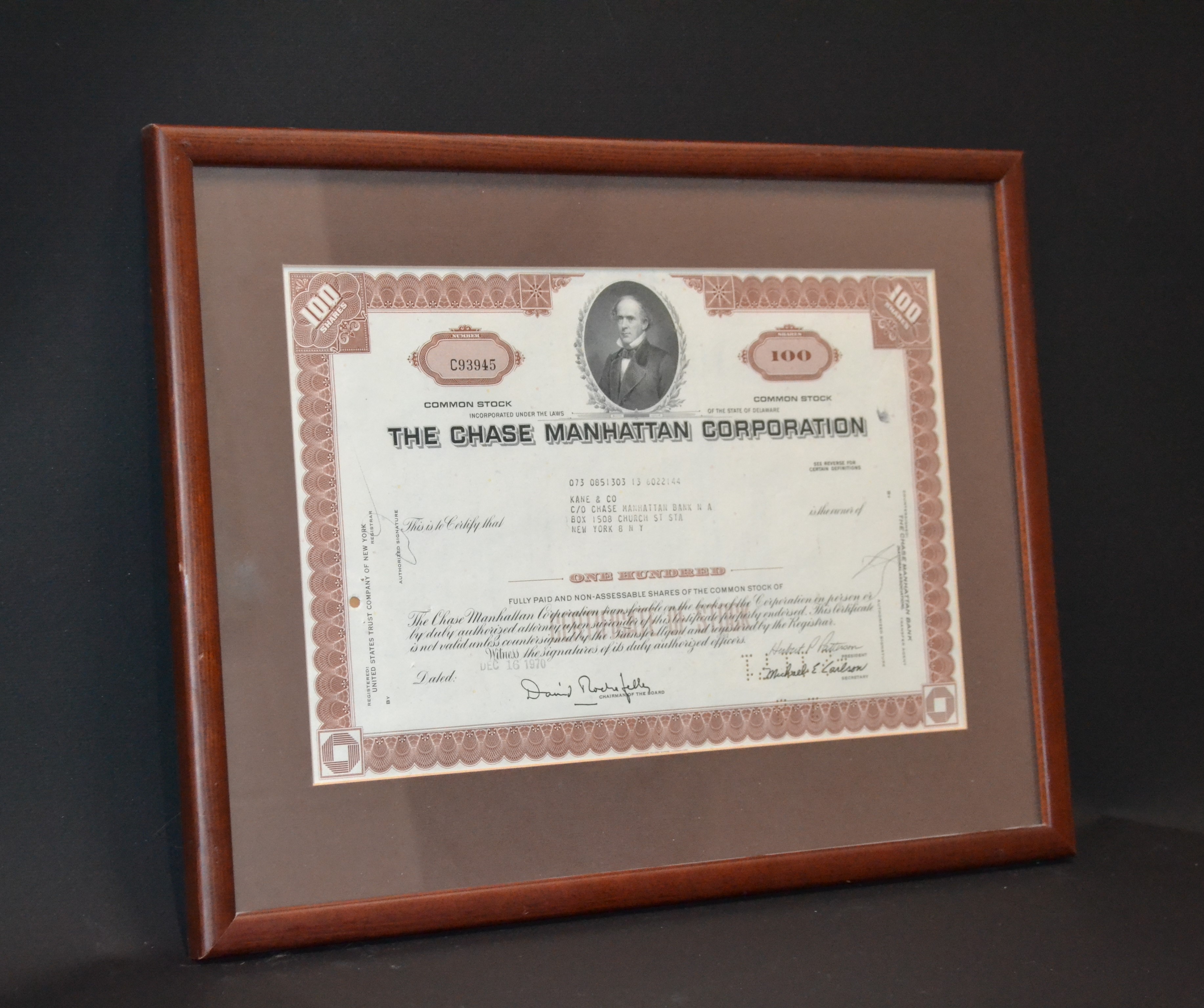 ----США The Chase Manhattan corporation сертификат в 100 акций 1970 в рамке со стеклом бумага 57-1-11