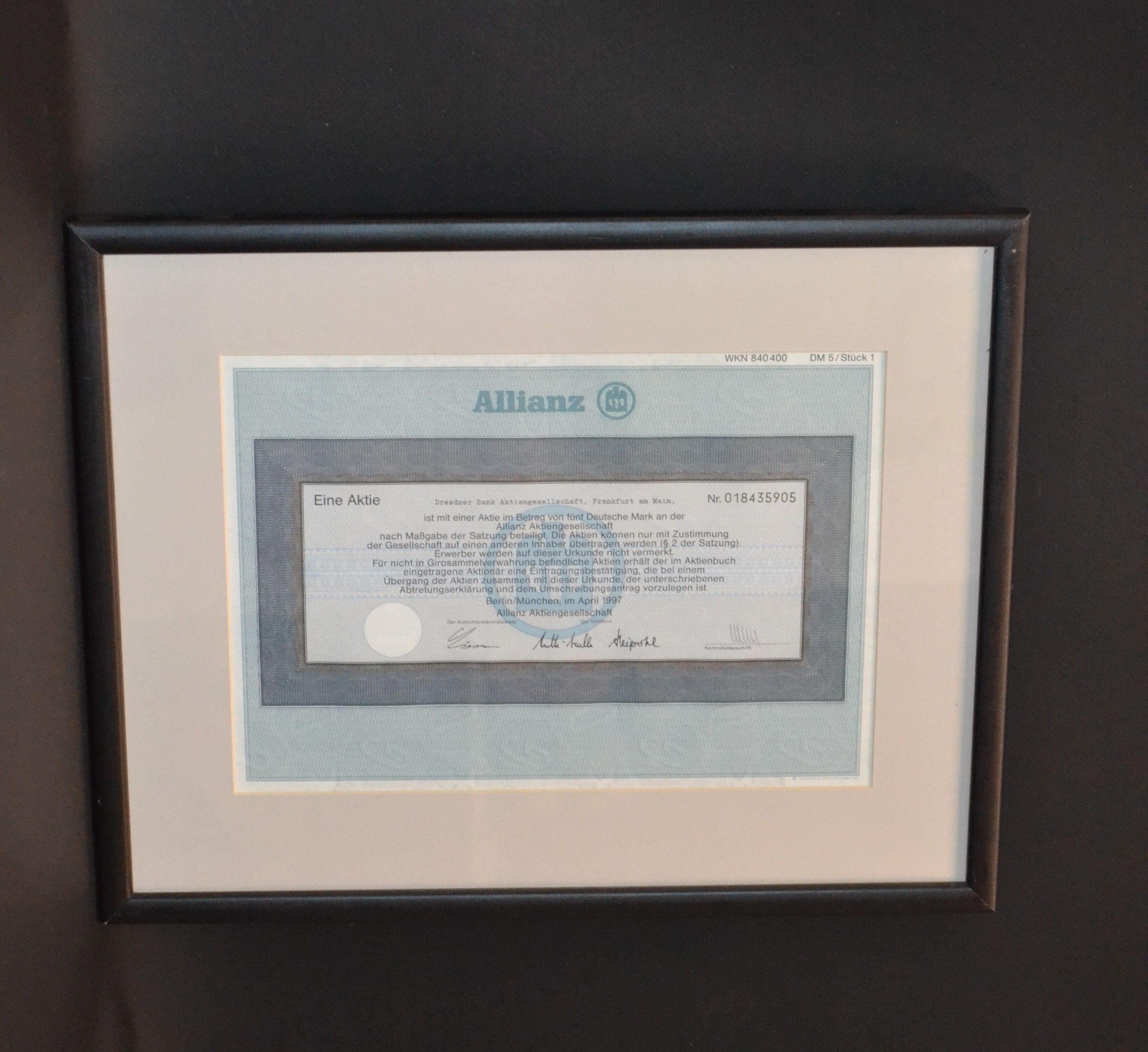 -----Германия, Allianz Versicherungs-AG акция в 5 марок 1997 в рамке со стеклом бумага 57-1-20