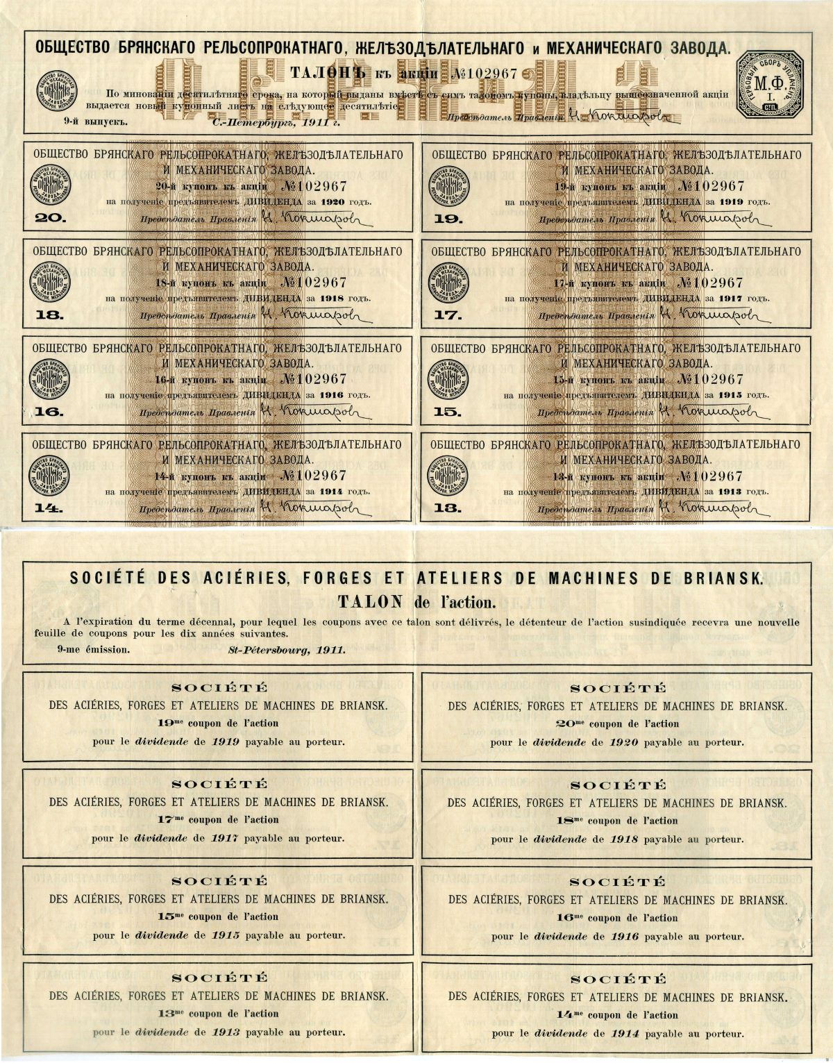 Россия, Общество Брянского рельсопрокатного, железоделательного и механического завода купонный лист (8 купонов на получение дивиденда) от пая 1911 бумага 8805-17-1