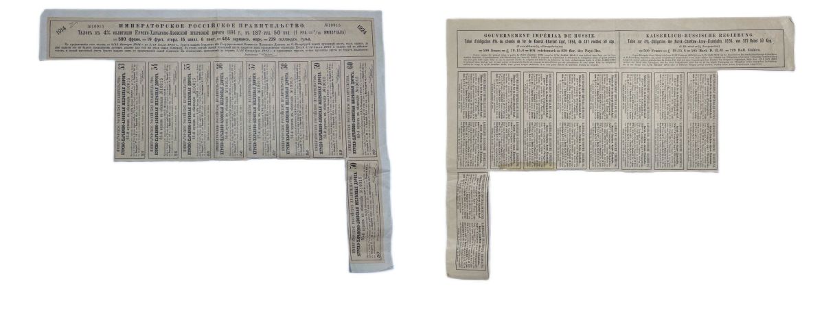 Россия, Общество Курско-Харьковско-Азовские железные дороги купонный лист (9 купов по 3 рубля 75 копеек) от 4 % облигации 1914 бумага 8609-18-1-2