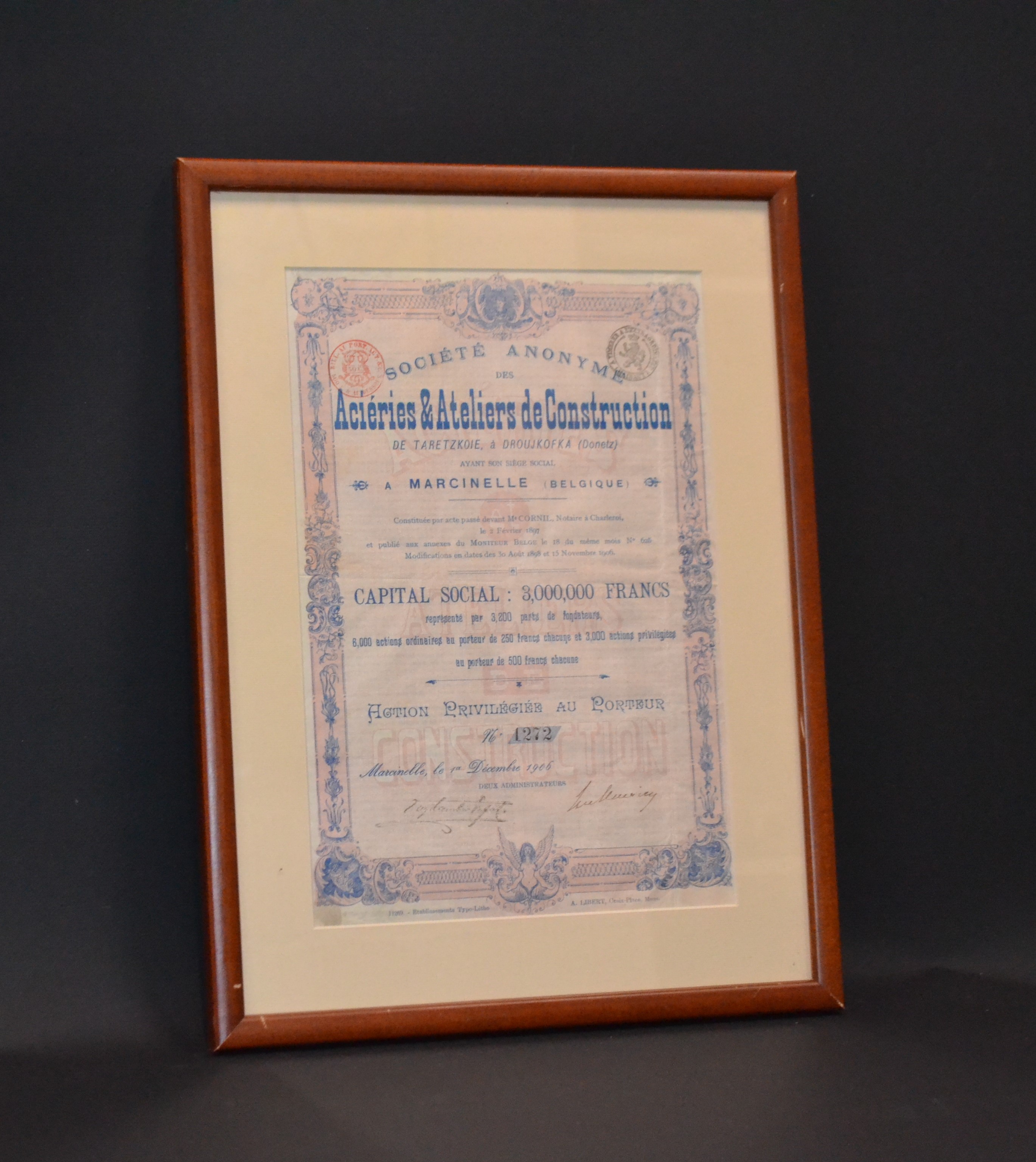 Россия (Бельгия), Акционерное общество металлургических заводов и строительных мастерских «Тарецкое» в Дружковке (Донецк) привилегированная акция 1906 в рамке со стеклом бумага 57-1-22