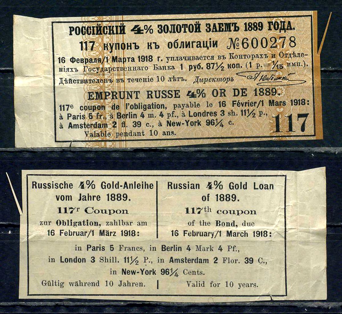 Россия, Золотой заем купон от 4% облигации на выплату 1 рубль 87 1/2 копейки 1889 Суррогат денежных знаков Сенкевич 244 бумага 8614-51-1-1