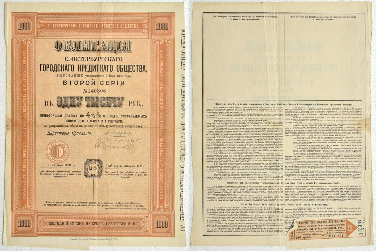РОССИЯ 4 1/2% ОБЛИГАЦИЯ В 1000 РУБЛЕЙ 1909 САНКТ-ПЕТЕРБУРГСКОЕ ГОРОДСКОЕ КРЕДИТНОЕ ОБЩЕСТВО, ВТОРАЯ СЕРИЯ бумага 510-4-1