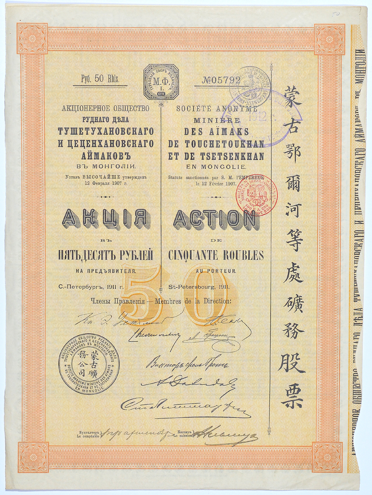 ----РОССИЯ Акционерное общество рудного дела Тушетухановского и цеценхановского аймаков. Акция в 50 рублей на предъявителя. № 05792. Санкт-Петербург. 1911 бумага 5553-15