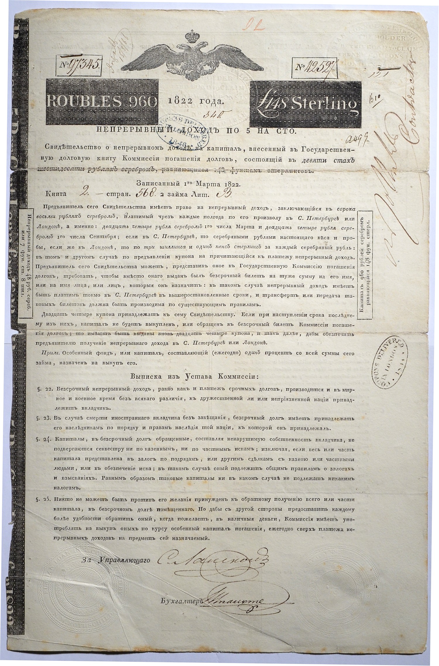 РОССИЯ ОБЛИГАЦИЯ, ЗАЕМ КОМИССИЯ ПОГАШЕНИЯ ДОЛГОВ 5% ЛИСТ НА 960 РУБЛЕЙ 1822 бумага 50-20-1