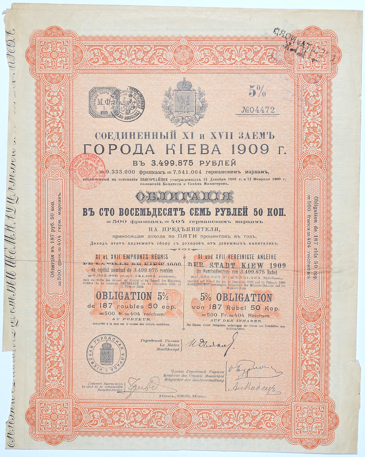 РОССИЯ СОЕДИНЕННЫЙ 11-Й И 17-Й ЗАЕМ ГОРОДА КИЕВА 1909 5% ОБЛИГАЦИЯ В 187 РУБЛЕЙ 50 КОПЕЕК НА ПРЕДЪЯВИТЕЛЯ 1909 бумага 49-15-1