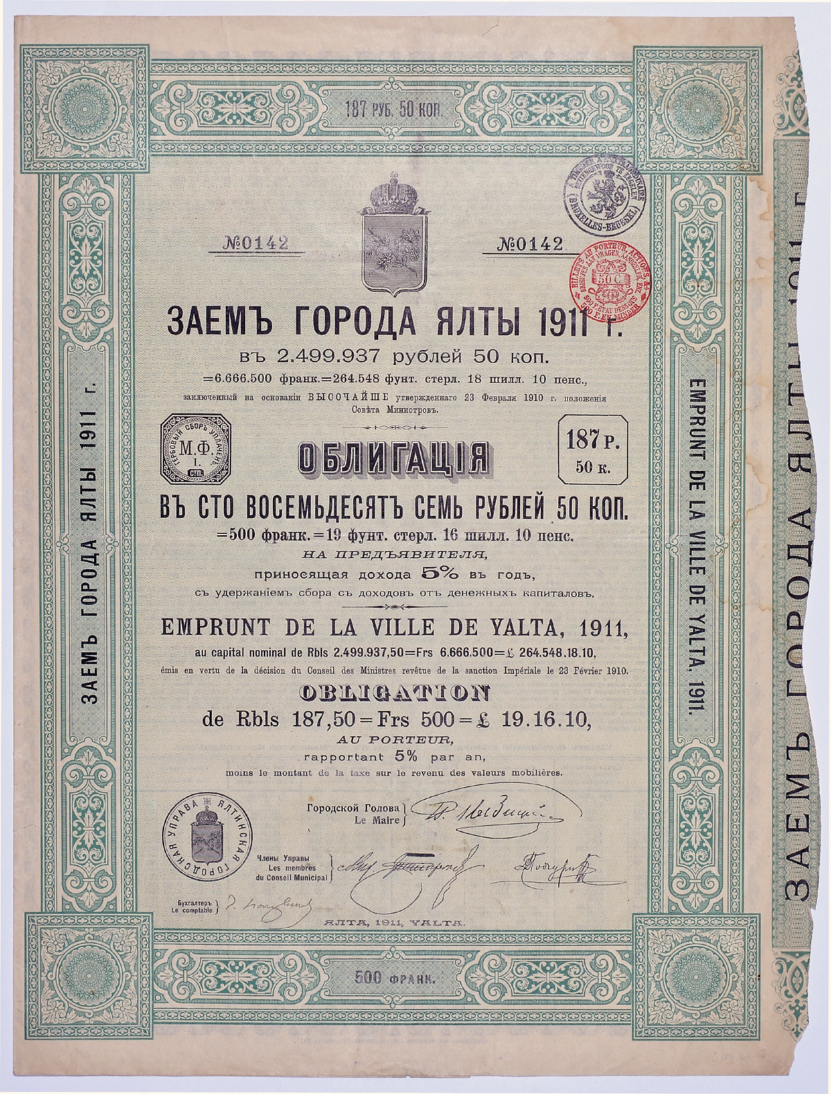 РОССИЯ ЗАЕМ ГОРОДА ЯЛТЫ 5% ОБЛИГАЦИЯ В 187 РУБЛЕЙ 50 КОПЕЕК НА ПРЕДЪЯВИТЕЛЯ 1911 бумага 49-9-1