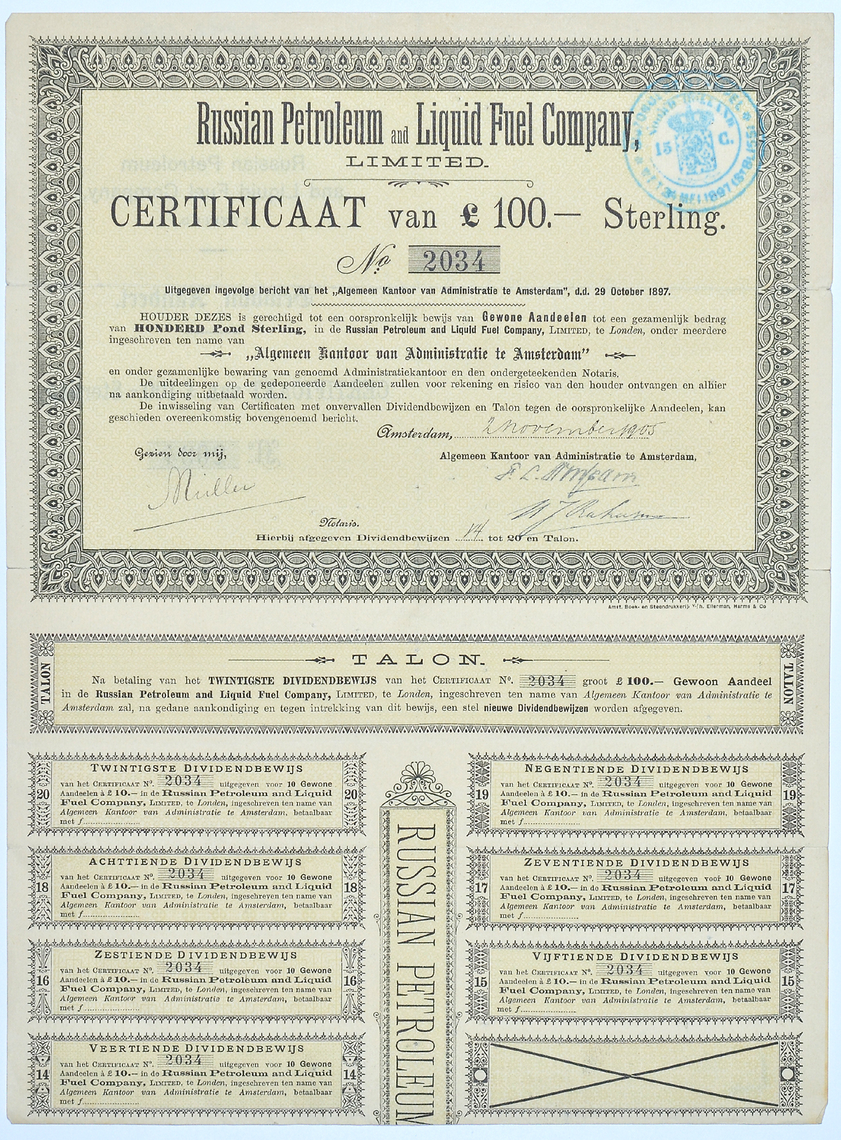 Русское Нефтянная и Жидко-Топливная Компания (Russian Petroleum and Liquid Fuel Company) . Акция в 100 фунтов 1897. Купоны 14-20. № 2034 бумага 5553-20