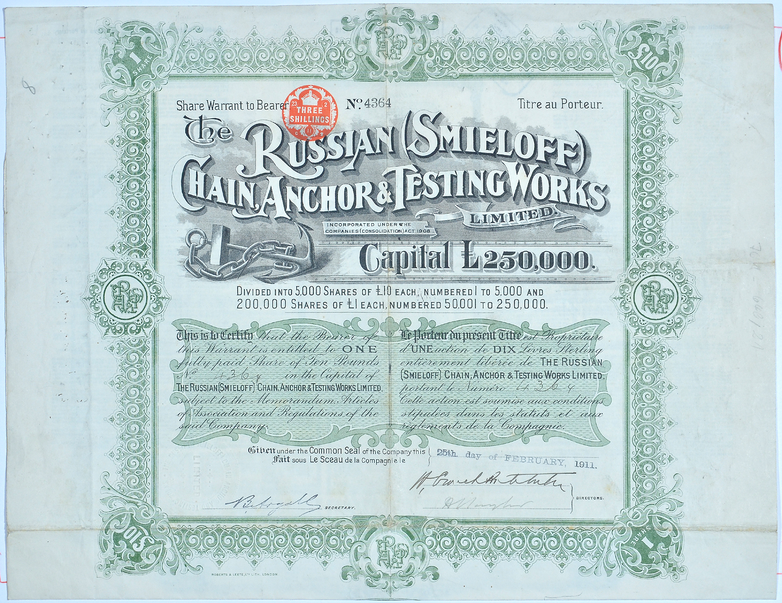 Русское (Смеловское) компания цепей, якорей и испытательных работ (Russian (Smieloff) Chain, Anchor & Testing Works). Акция в 1 фунт 1911. Купоны 5-40. № 4364 бумага 5553-27