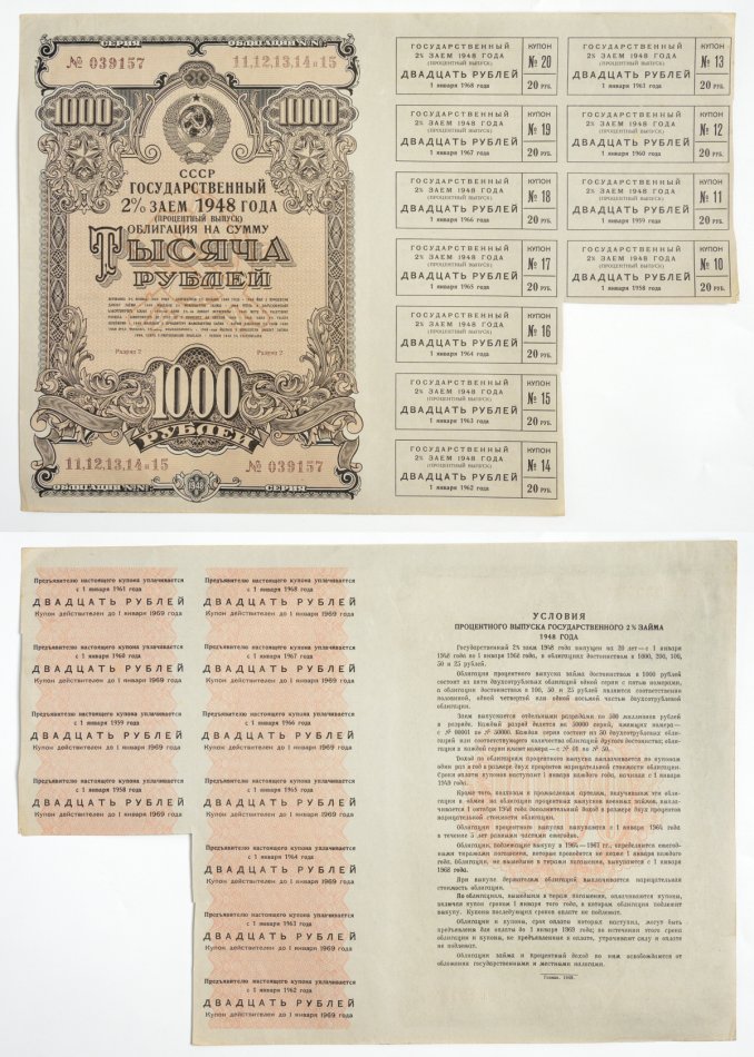 СССР 1000 рублей, 5 облигаций 1948 Государственный 2% заем, процентный выпуск. Купонов 10-20 Золотарев 48.2.5 бумага 5547-47-1-2