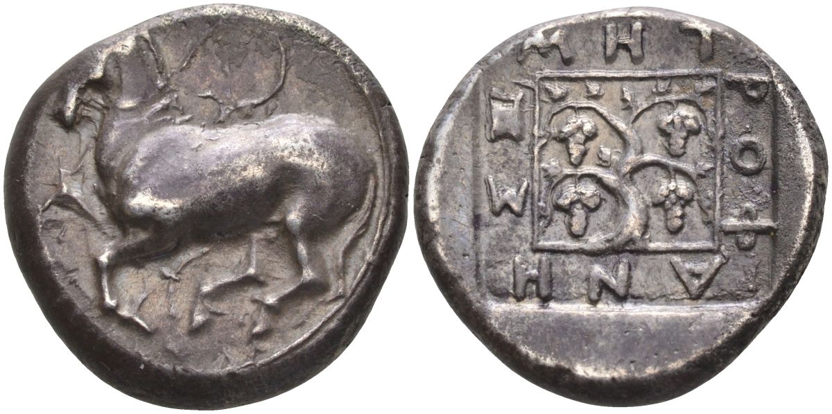 Древняя Греция, Фракия, Маронея тетрадрахма 411 - 397 гг. до н.э. магистрат Метрофанес, скачущая лошадь / имя магистрата, вписанное в квадрат вокруг виноградной лозы, 12,88 гр, extremely fine Schonert-Geiss 165 серебро 10-020-67