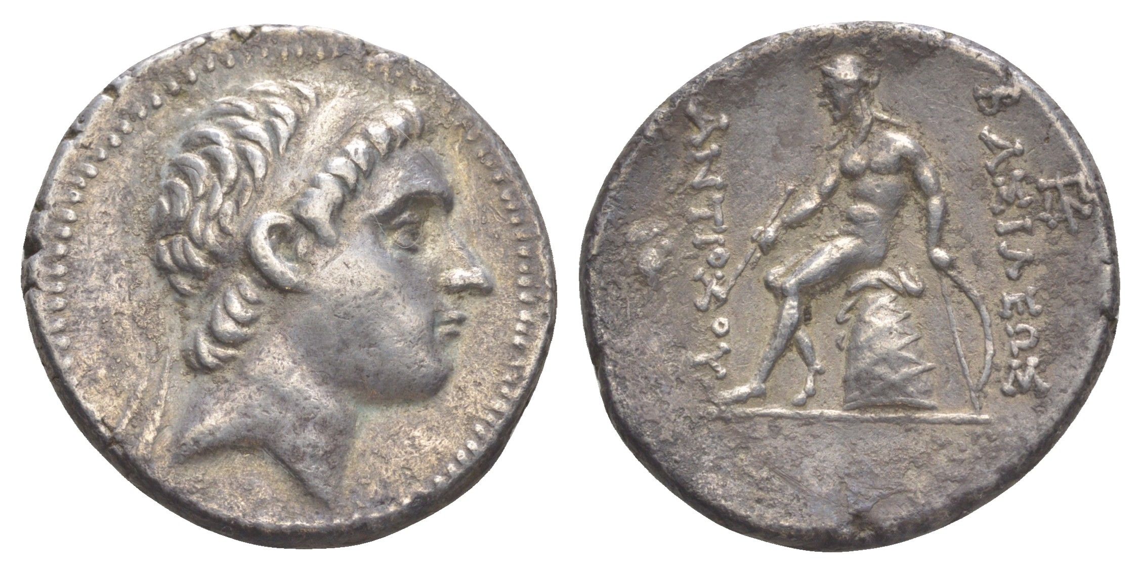 ----Государство Селевкидов тетрадрахма 213-205 гг. до н.э. Антиох III Великий, голова царя/Аполлон, сидящий на Омфале, держащий лук и стрелу, 16,87 гр, Эдесса HGC 9, 447bb серебро 00-812-18