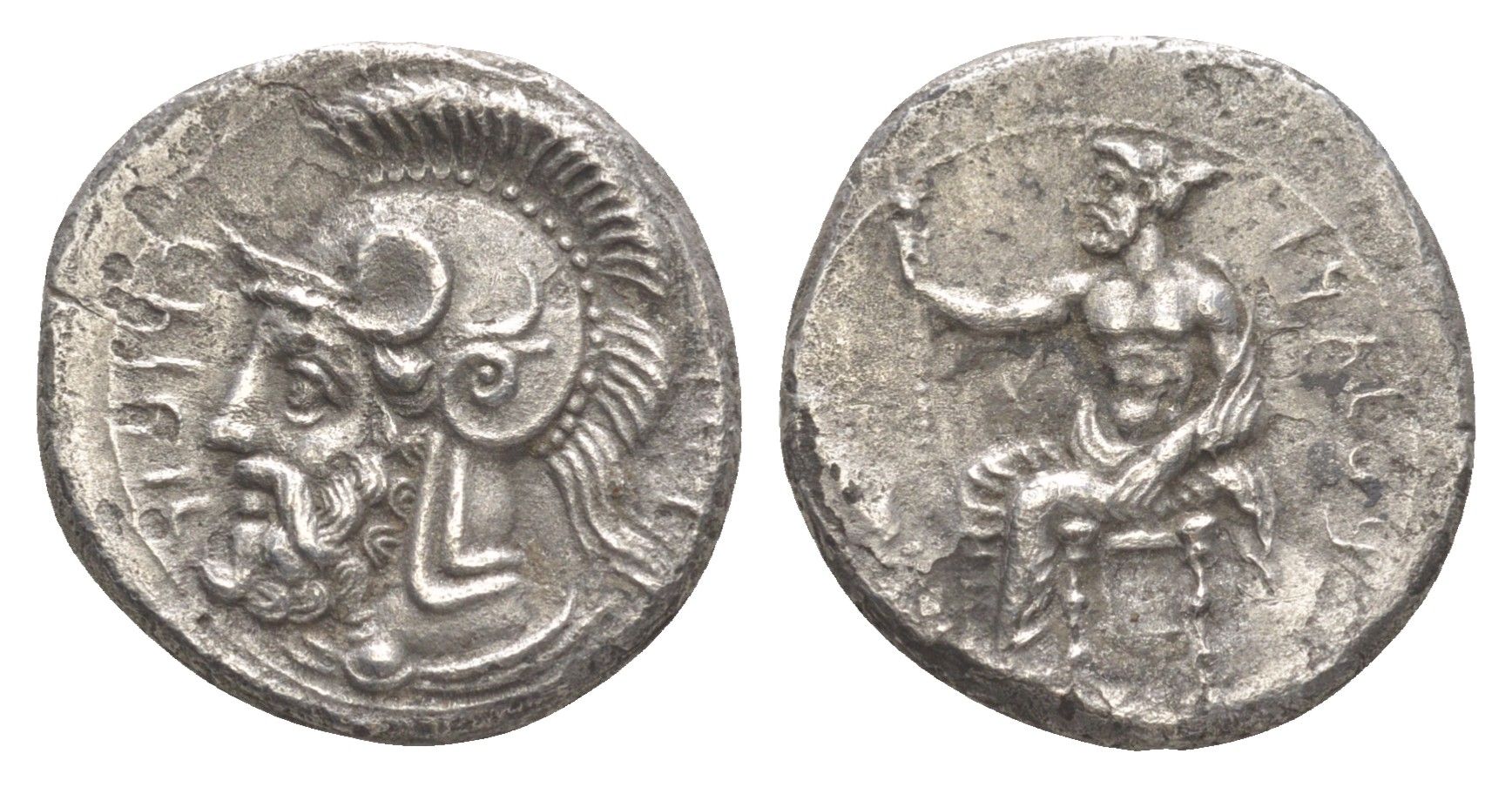 Киликия, Тарс статер 379-374 гг. до н.э. сатрап Фарнабаз, Баалтарс на троне, держащий лотос/голова Ареса в аттическом шлеме, 10,08 гр SNG Paris 256 серебро 00-812-09