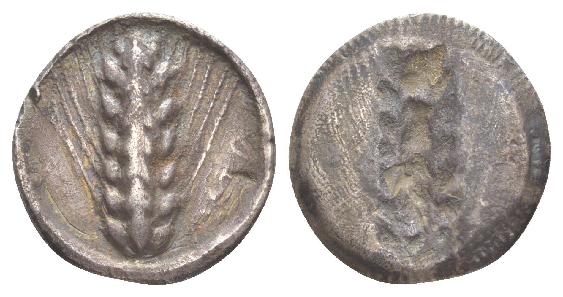 Лукания, Метапонт статер 540-510 гг. до н.э. META, колос с зернами/иннкузное изображение колоса, 7,45 гр Noe class VI серебро 00-814-05