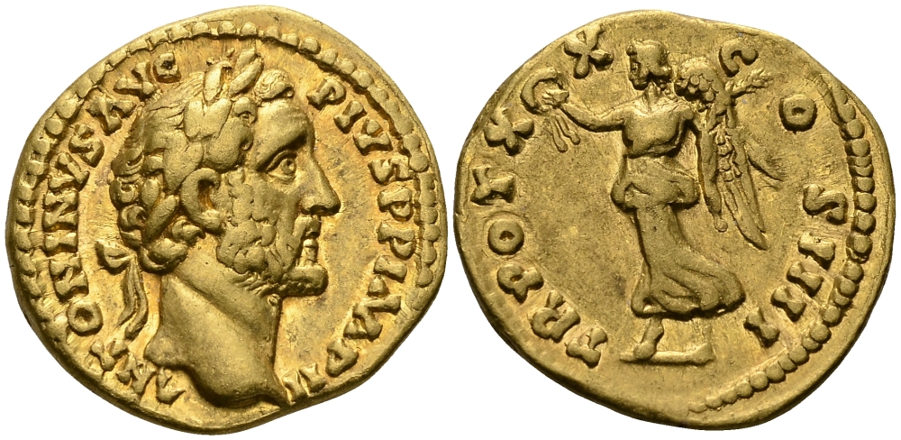 Римская Империя аурей 156 - 157 Антонин Пий TR POT XX COS IIII Виктория, богиня Победы, Рим, 7,22 гр Good Very fine RIC 266a, Calic? 1675 золото 10-011-54