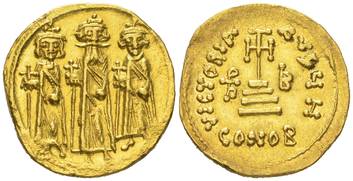 Византийская Империя солид 610-641 Ираклий с Ираклием Константином и Ираклионом/крест, Константинополь, 4,38 гр, about extremely fine Sear 767 золото 10-020-82