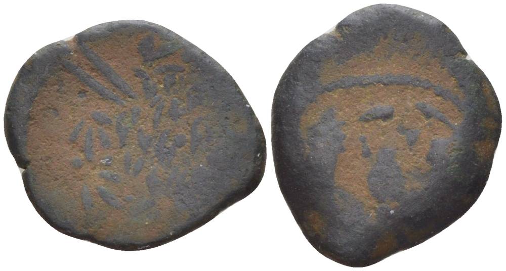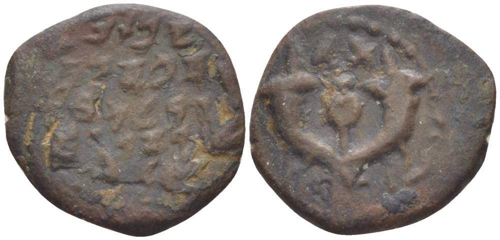 Иудея, династия Хасмонеев прута 64 - 40 гг. до н.э. Иоанн Гиркан II, легенда на иврите в пять строк 'Иоханан, Первосвященник и Глава Синедриона' в венке / два рога изобилия, гранатовый плод, Иерусалим Hendin 1159 медь 1073-21-23