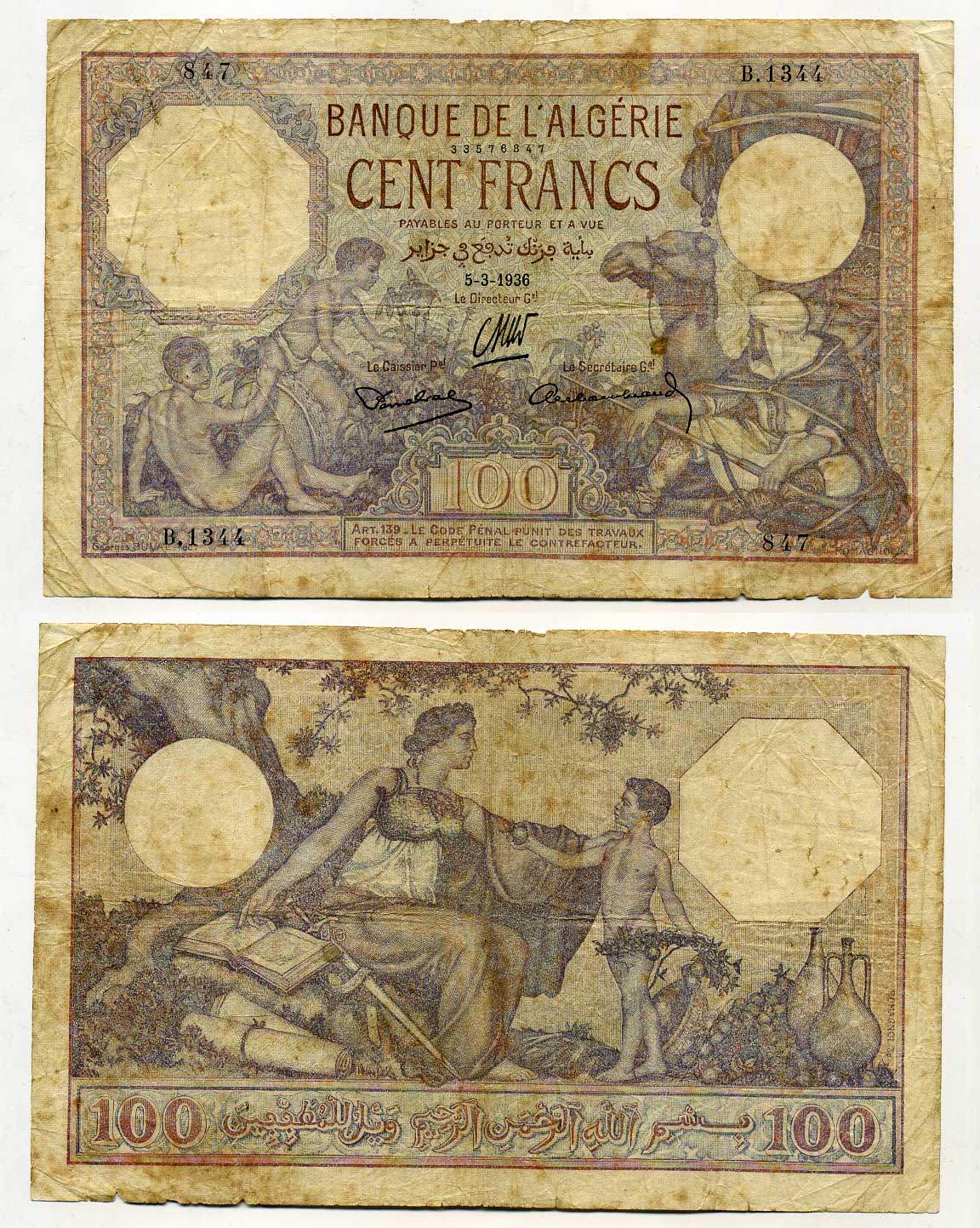 АЛЖИР 100 ФРАНКОВ 1936 Pick 81 b бумага 448-93-2