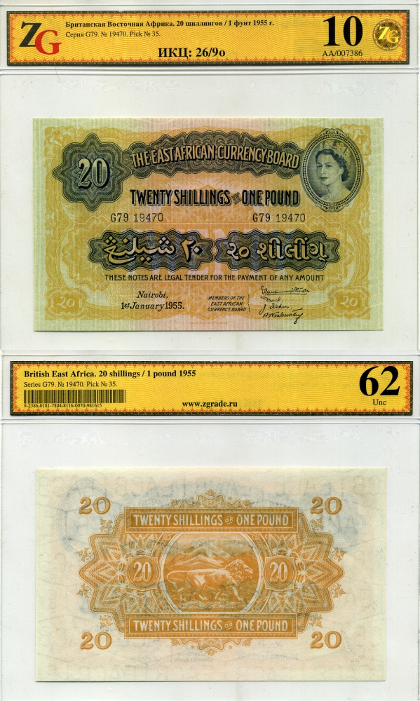 БРИТАНСКАЯ ВОСТОЧНАЯ АФРИКА 20 ШИЛЛИНГОВ = 1 ФУНТ 1955 1 ЯНВАРЯ 1955, ЕЛИЗАВЕТА II (1952-), в холдере компании ZG. Сохранность - 10 Pick 35 бумага UNC (ПРЕСС) 000-000-00
