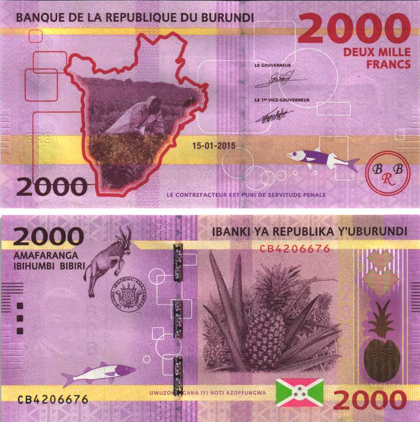 -Бурунди 2000 франков 2015 15 января 2015, Бурунди на карте, рыба, антилопа, ананас, флаг Pick 52 бумага UNC (пресс) 448-10-3УгандаМавританияМадагаскарМалавиМароккоМозамбикНигерияРуандаСвазилендСуданСьерра-ЛеонеТанзанияТунисМаврикийФранцузская Западная АфрикаФранцузская Экваториальная АфрикаЭкваториальная ГвинеяЭритреяЭфиопияЮАРДругие страныГвинея-БисауЛесотоКоморские островаСомалиСан-Томе и ПринсипиАлжирАнголаБиафраБотсванаЛивияГамбияГанаГвинеяЕгипетЗаирЗамбияЗимбабвеКабо-ВердеКенияКонгоЛиберия