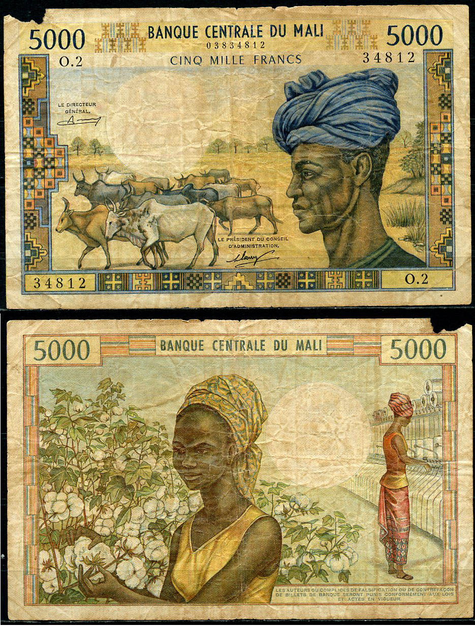 Мали 5000 франков ND (1972-1984) пастух со стадом, сбор и переработка хлопка Pick 14 a бумага 451-262-2