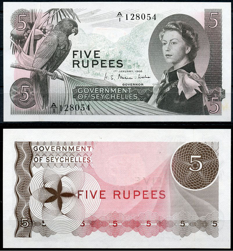 Сейшельские острова 5 рупий 1968 Елизавета II (1952-2022), черный попугай Pick 14 a бумага UNC (пресс) 451-721-2