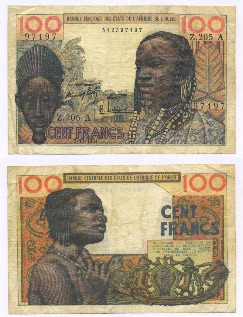 ФРАНЦУЗСКИЕ ЗАПАДНО-АФРИКАНСКИЕ ШТАТЫ 100 ФРАНКОВ 1964 БУКВА А, КОТ-д' ИВУАР, ПОДПИСЬ 3, 2 ДЕКАБРЯ 1964 Pick 101Аd бумага 6301-40-2