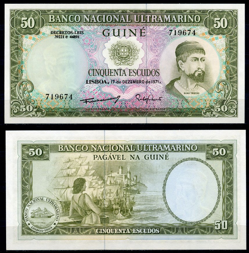 Португальская Гвинея 50 эскудо 1971 Нуну Триштан, корабль, женщина Pick 44 a (2) бумага UNC (пресс) 448-138-1