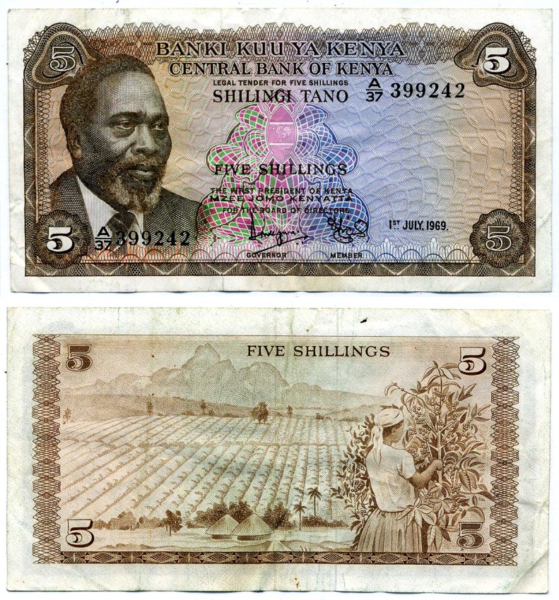 Кения 5 шиллингов 1969 1 июля 1969, подпись 2, Джомо Кениата Pick 6а бумага 6287-13-1-2