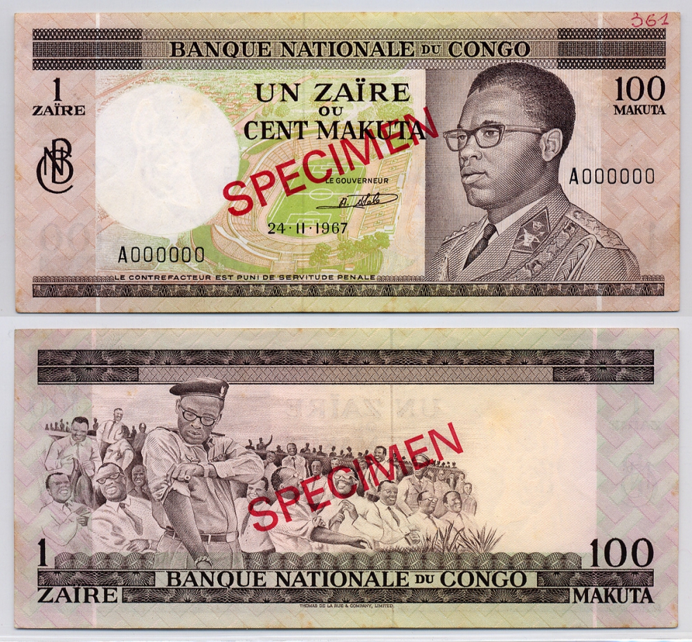 КОНГО 1 ЗАИР ИЛИ 100 МАКУТА 1967 ОБРАЗЕЦ Pick 12s1 бумага aUNC 451-362-3