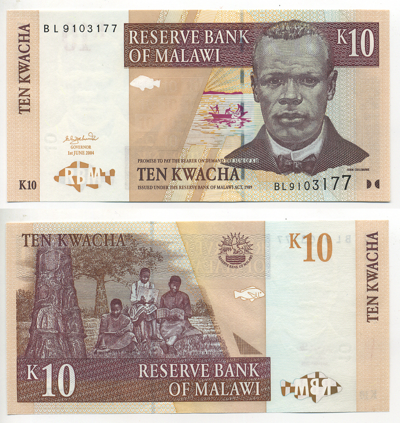 МАЛАВИ 10 КВАЧА 2004 1 ИЮНЯ 2004, ДЖОН ЧИЛЕМБВЕ Pick 51а бумага UNC (ПРЕСС) 6299-37-3