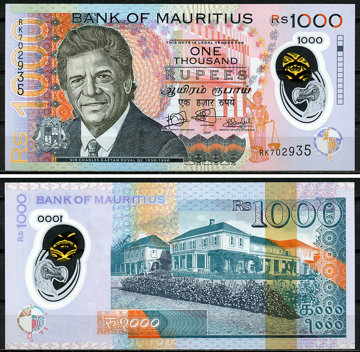 Маврикий 1000 рупий 2024 сэр Шарль Гаэтан Дюваль (1930-1996), Порт-Луи Pick 66A пластик UNC (пресс) 451-1087-1