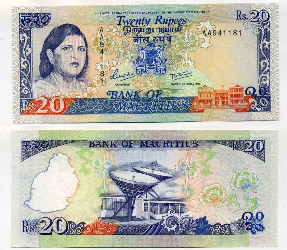 Маврикий 20 рупий ND (1985) Леди Джагнат, спутниковая антена, подпись 5 Pick 36 бумага UNC (пресс) 8589-45-2-1