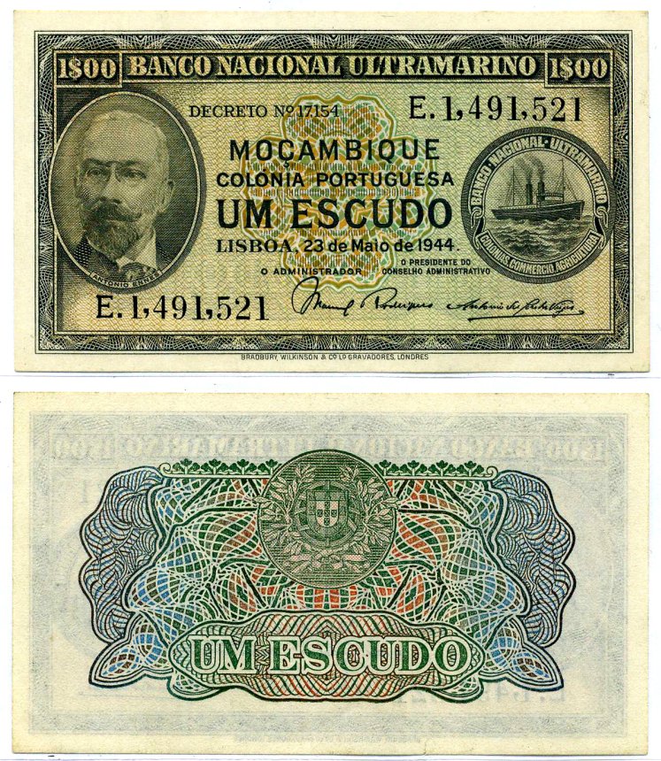 Мозамбик 1 эскудо 1944 23 МАЯ 1944, АНТОНИУ ЭНЕШ Pick 92 бумага аUNC 451-345-2