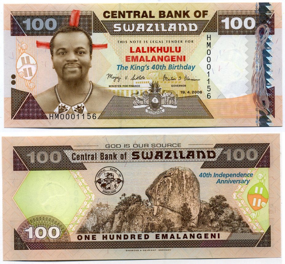 Свазиленд 100 емалангени 2008 король Мсвати III, 40 лет со дня рождения и 40 лет независимости Pick 34 бумага UNC (пресс) 451-120-2