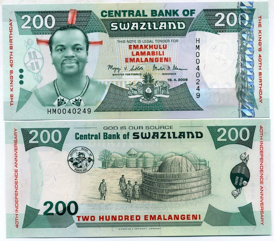 Свазиленд 200 емалангени 2008 король Мсвати III, 40 лет со дня рождения и 40 лет независимости Pick 35 бумага UNC (пресс) 451-108-1
