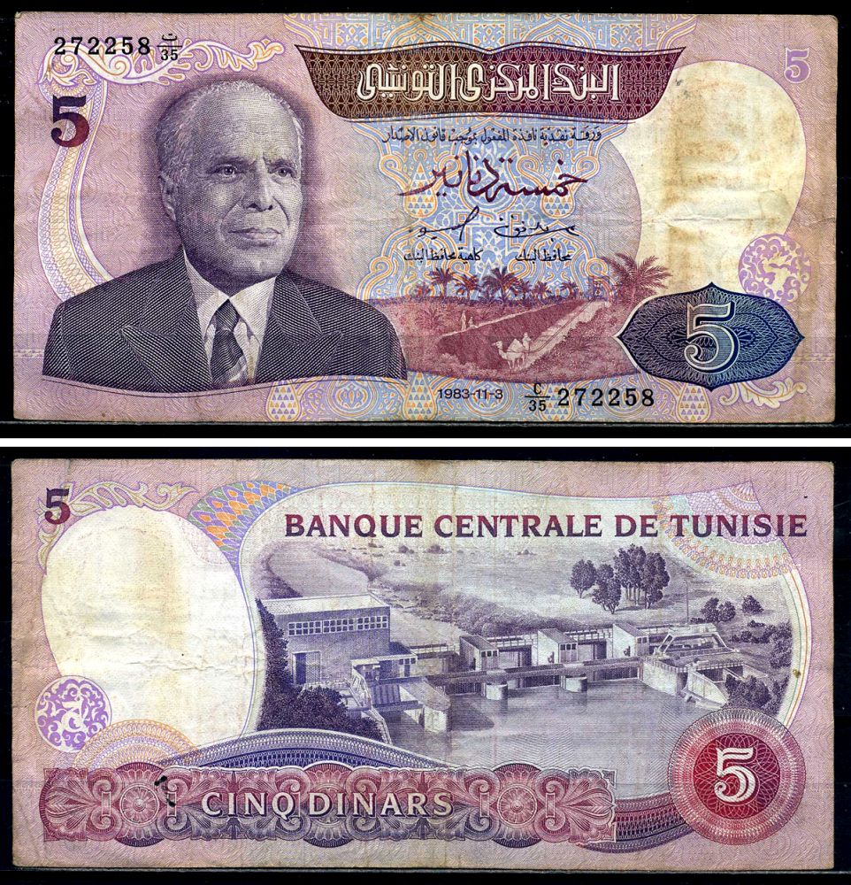 Тунис 5 динаров 1983 3 ноября 1983, Хабиб Бургиба Pick 79 бумага 8602-28-3-1
