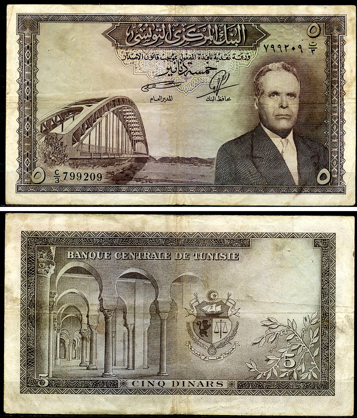 Тунис 5 динаров ND (1958) Президент Хабиб Бургиба, мост Pick 59 бумага 8588-25-2-2