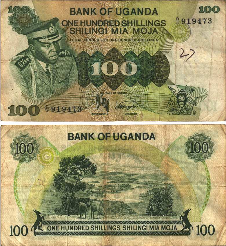 -Уганда 100 шиллингов ND (1973) серия D/3, президент Иди Амин, Governor and Director, ландшафт Pick 9a бумага F-VF 7116-39-3-2МавританияМадагаскарМалавиМароккоМозамбикНигерияРуандаСвазилендСуданСьерра-ЛеонеТанзанияТунисМаврикийФранцузская Западная АфрикаФранцузская Экваториальная АфрикаЭкваториальная ГвинеяЭритреяЭфиопияЮАРДругие страныГвинея-БисауЛесотоКоморские островаСомалиСан-Томе и ПринсипиБурундиАлжирАнголаБиафраБотсванаЛивияГамбияГанаГвинеяЕгипетЗаирЗамбияЗимбабвеКабо-ВердеКенияКонгоЛиберия