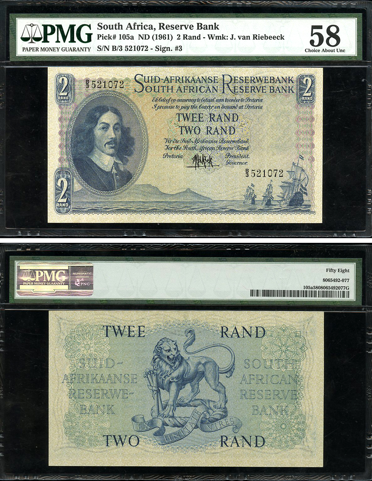 ЮАР 2 ранда ND (1961) Бартоломеус Вермуйден, лев, африкаанс-английский, в слабе PMG 58 Choice About Uncirculated Pick 105 a бумага aUNC 452-1-22