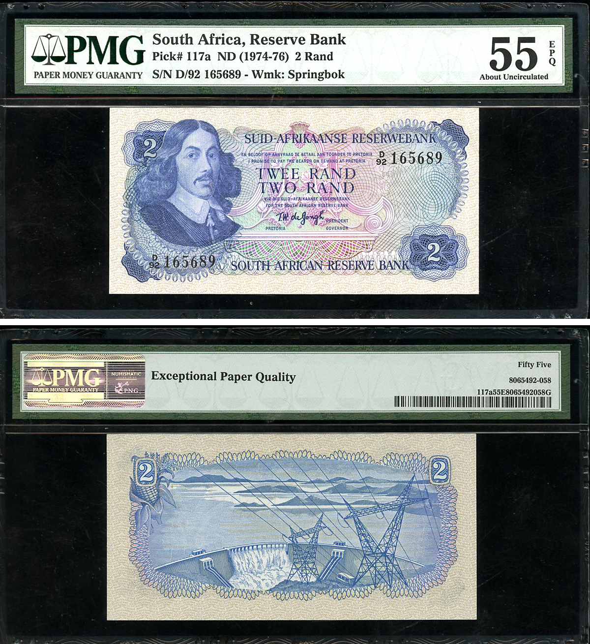 ЮАР 2 ранда ND (1974-76) Бартоломеус Вермуйден, ГЭС Гариеп, африкаанс-английский, в слабе PMG 55 About Uncirculated Pick 117 a бумага aUNC 452-1-23