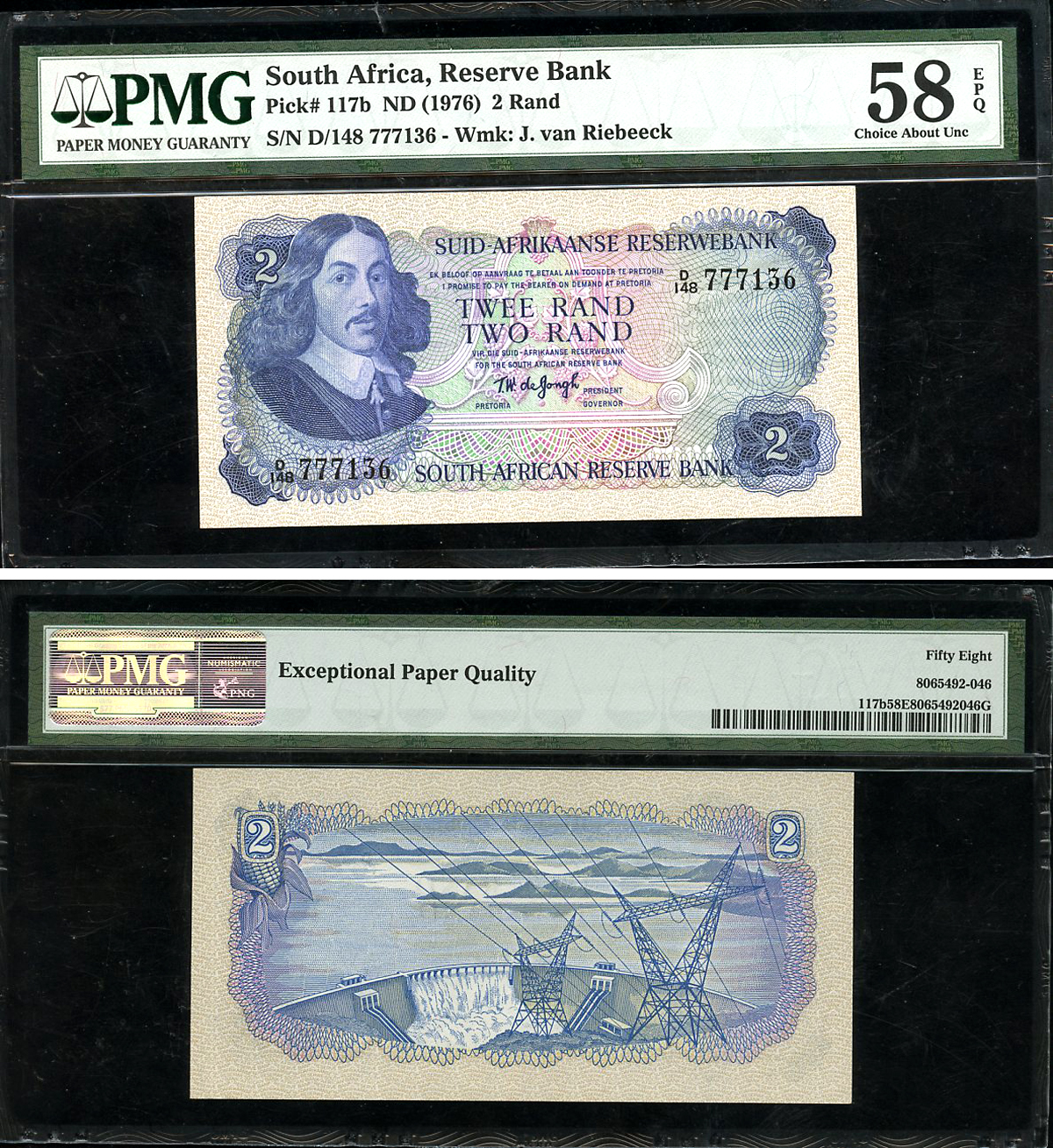 ЮАР 2 ранда ND (1976) Бартоломеус Вермуйден, ГЭС Гариеп, африкаанс-английский, в слабе PMG 58 Choice About Uncirculated Pick 117 b бумага aUNC 452-1-24