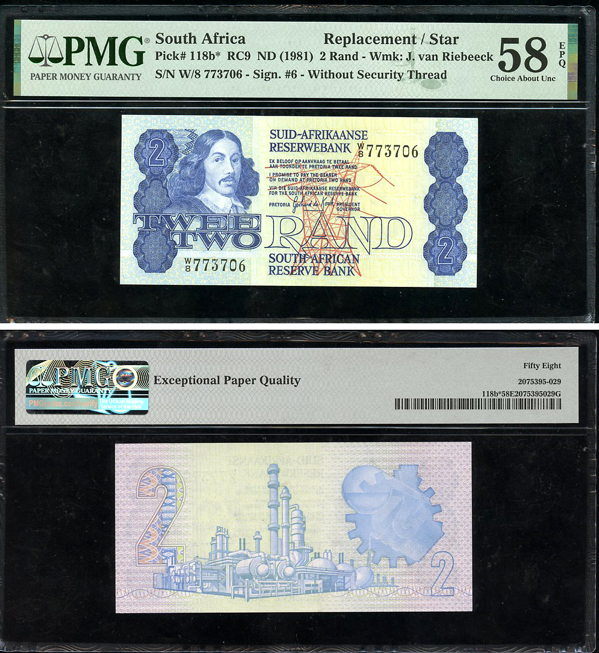ЮАР 2 ранда ND (1981) Бартоломеус Вермуйден, нефтеперерабатывающий завод, африкаанс-английский, в слабе PMG 58 Choice About Uncirculated Pick 118 b бумага aUNC 452-1-56
