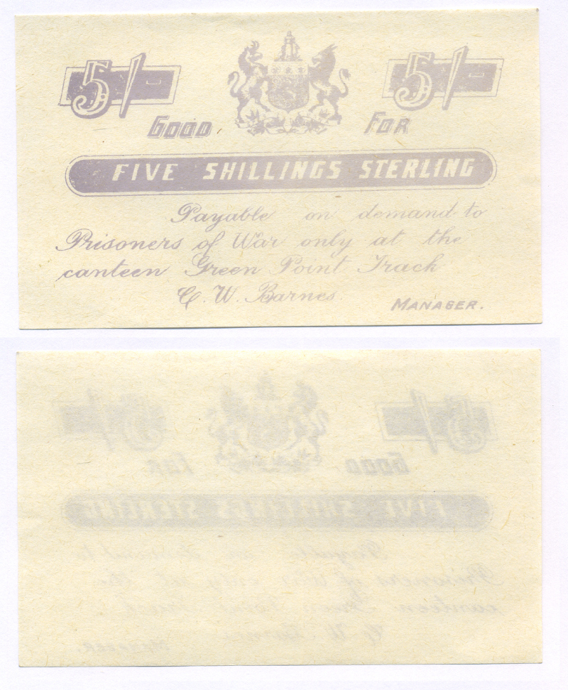 Южная Африка 5 шиллингов стерлингов 1899-1902 оплачивается при предъявлении в столовой лагеря военнопленных Green Point Track, Англо-Бурская война (1899-1902), сиреневая печать бумага UNC (пресс) 451-672-1