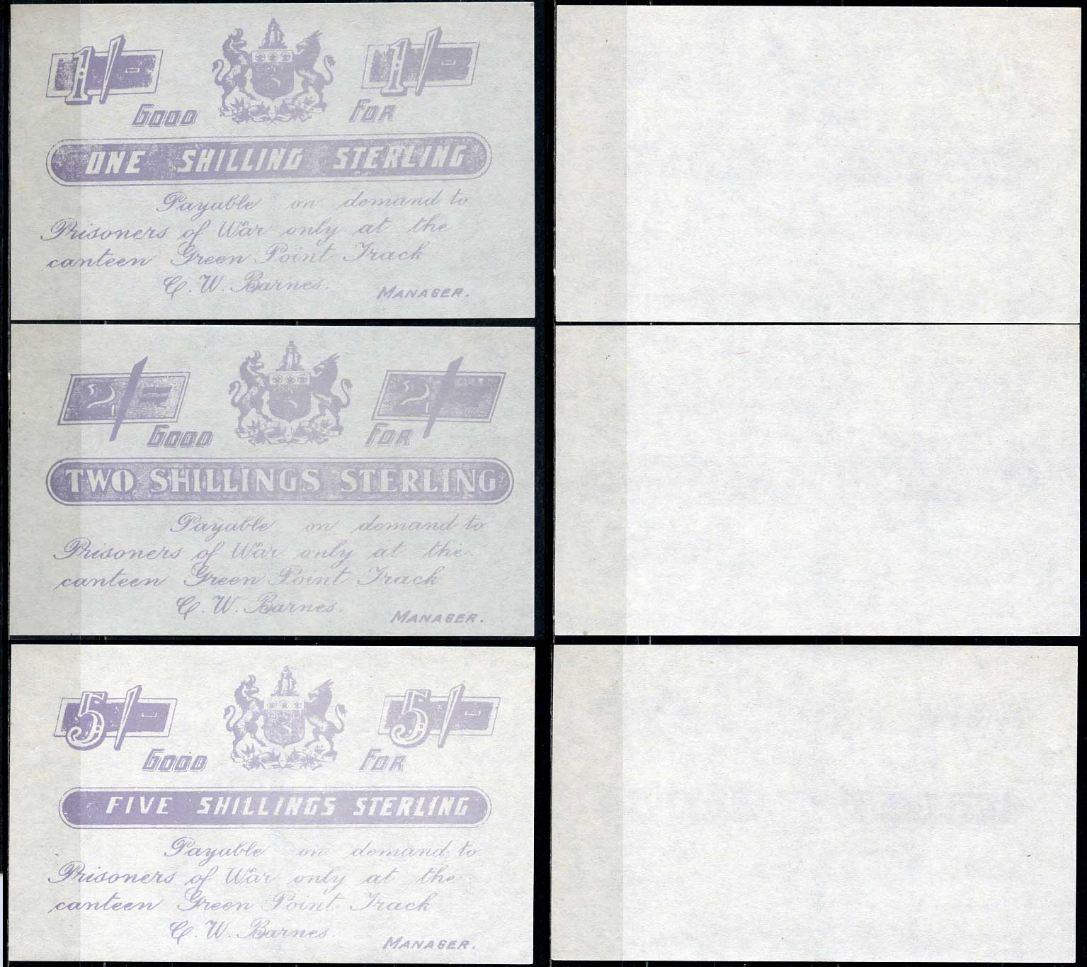 Южная Африка набор из 3 банкнот, 1, 2, 5 шиллингов стерлингов 1899-1902 оплачивается при предъявлении в столовой лагеря военнопленных Green Point Track, Англо-Бурская война (1899-1902), сиреневая печать бумага UNC (пресс) 451-671-1