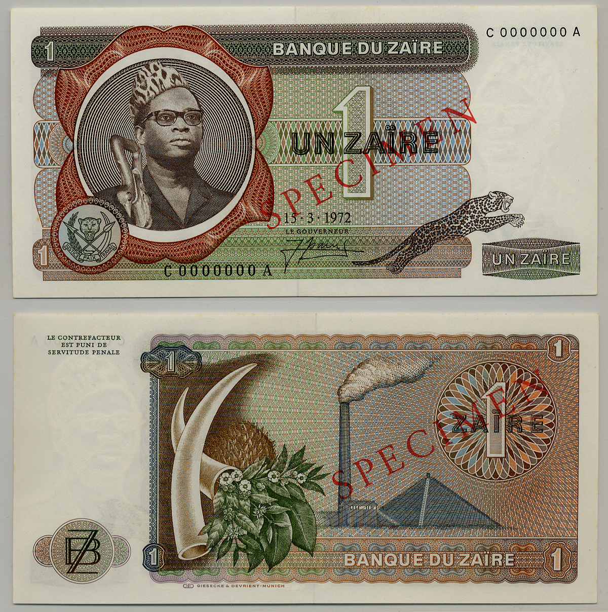 Заир 1 заир 1972 Мобуту Сесе Секо, бивни слона, фабрика. Образец, Specimen Pick 18 a s бумага aUNC 6279-13-3-1